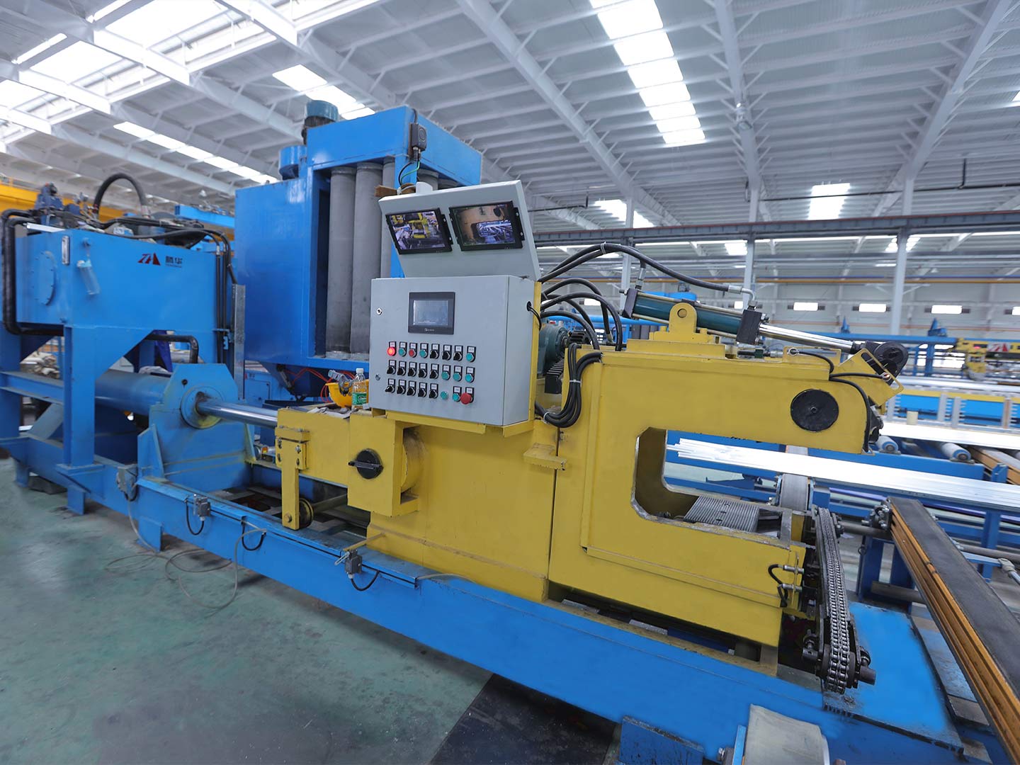 - 滑出臺:是輸送輥道,毛氈滾筒帶動力傳動,輸送速度可調。抬起時輔助型材滑出,通過升降錯位與挑料裝置配合橫向取料到冷卻臺。